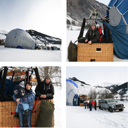 Als ik terugkom, zijn ze aan het inpakken. Ibon mag ook even in het mandje, maar dat vind-ie nog een beetje eng. Tobi vindt alles goed in de ruggedrager. De ballonvaarders worden ondertussen met champagne gedoopt tot ‘baron en baronnesse van Zell am See naar Rauris’.