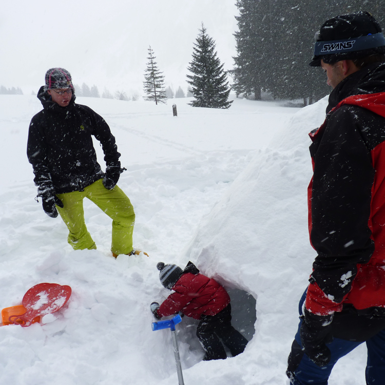 Dit weekend slapen Hans en – uit Nederland overgekomen – vriend Dick in een iglo. Zelf gebouwd op een geheime plek in het dal… Ik heb hen ze gister samen met de kids opgezocht. Als we aankomen zijn ze net klaar met bouwen. Alleen de voortunnel moet nog.