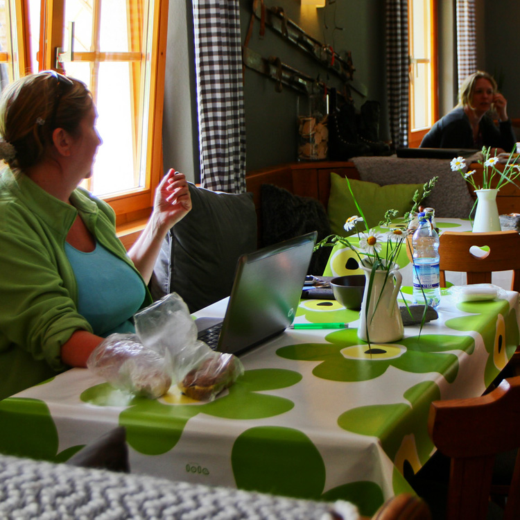 Daarnaast was ze in de schrijfweek ook onze vrolijke ontbijtkok in de Berghut: ze zwaaide elke morgen door het keukenraampje naar de gasten en coachte ook nog de vroege vogels die vóór het ontbijt al zaten te typen in de Stube. “Hallo leukerds!”
